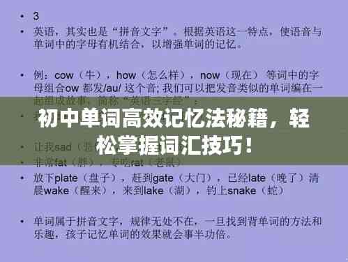 在初中阶段,英语学习尤为重要,其中单词记忆是学习英语的基础,许多初中生在记忆单词时感到困难,效率低下,本文将为大家分享一些初中单词高效记法,帮助同学们更好地掌握英语单词,提高学习效率。